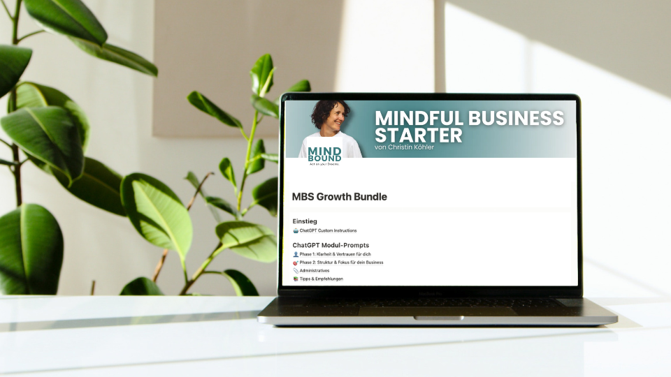 Rechtlicher Hinweis: Der Mindful Business Starter (MBS) ist ein strukturiertes Selbstlernprogramm mit optionalem Zugang zu einer Community. Es handelt sich nicht um ein Coaching im rechtlichen Sinne, es erfolgt keine individuelle Beratung, keine persönliche Betreuung und keine Lernzielkontrolle. Alle Inhalte dienen der eigenverantwortlichen Umsetzung im eigenen Tempo. Es besteht keine Erfolgsgarantie.